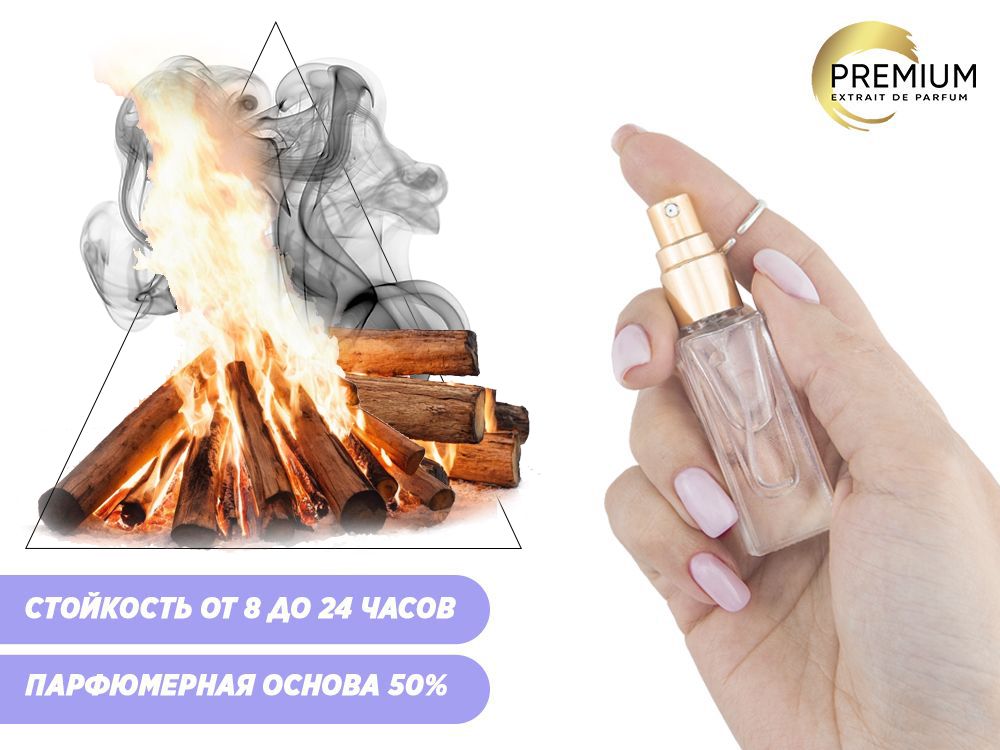 Он насыщен древесными нотами, дымными акцентами и легкой сладостью горелого дерева. В этом ароматическом сочетании ощущается энергия огня — его тепло, искры и мягкий тлен догорающих поленьев. Такой запах создает атмосферу уединения и ностальгии по летним ночам, проведенным на природе, и подходит для тех, кто ценит домашний уют и спокойствие.